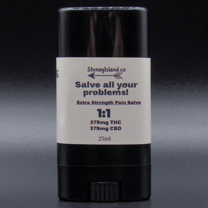 Stoney Island Company’s Extra strength 350mg THC and CBD 1:1 Pain Cream in a cute 2oz reusable glass jar.